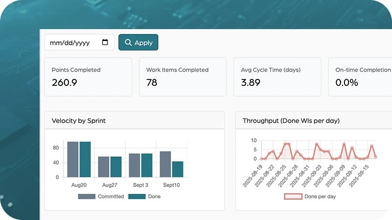 The Product Backlog is the complete list of features, ideas, and improvements that guide the team’s work. From this, the Sprint Backlog is created, outlining the specific tasks the team will focus on during the sprint. Each sprint ends with an Increment, a working product that delivers tangible value. With real-time analytics, teams can track progress as work happens, monitor performance, and adjust immediately to stay on target.